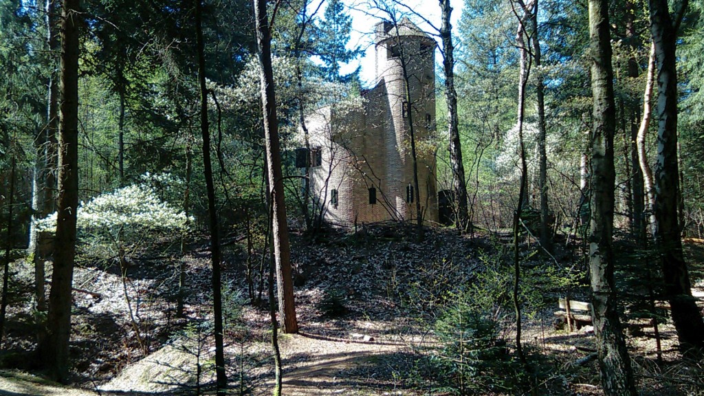 Maar 1938 bracht nog iets heel anders. Voorjaar en zomer verstreken met de uitwerking van plannen voor de bouw van een toren-vormig onderkomen, de aanvraag en verkrijging van de onontbeerlijke vergunning van de gemeente Hilversum en vervolgens de realisering in augustus en september met de voltooiing in oktober (*7). De architect was Jan Rebel uit Laren, bekend door zijn villabouw door heel het land. Aanvankelijk kon de toren als uitkijkpost dienst doen, maar met het klimmen der jaren werd het gebouw (relatief) kleiner en het omgevend en insluitend bos hoger. De plaats was nauwgezet gekozen en wel op een heuvelruggetje met daarnaast een tamelijk steile uitgestoven laagte, waarin een “kommetje” van grondwater. Het niveauverschil is ongeveer zeven meter. De feitelijke bedoeling van de toren is opslagplaats van bosmateriaal en dagverblijf. Met de verwerking van handvormstenen, Slavonisch eikenhout en glas in lood van de Nijmeegse glazenier Ben Hofstee (o.a. voorstellingen van St. Barbara en St. Hubertus) is getracht er iets aantrekkelijks van te maken. De naam Wolfsdreuvik is niet zonder reden gegeven. Want op de kaart van Perk slaat die aanduiding op het zuidelijk deel van het gebied. Wolfsdreuvik betekent wolfsheuvel. Wolven kwamen er stellig voor tot diep in de achttiende eeuw. Er bestaat een legende, getiteld “De Wolvin in de Kerstnacht”, die op deze omgeving betrekking moet hebben (*8).