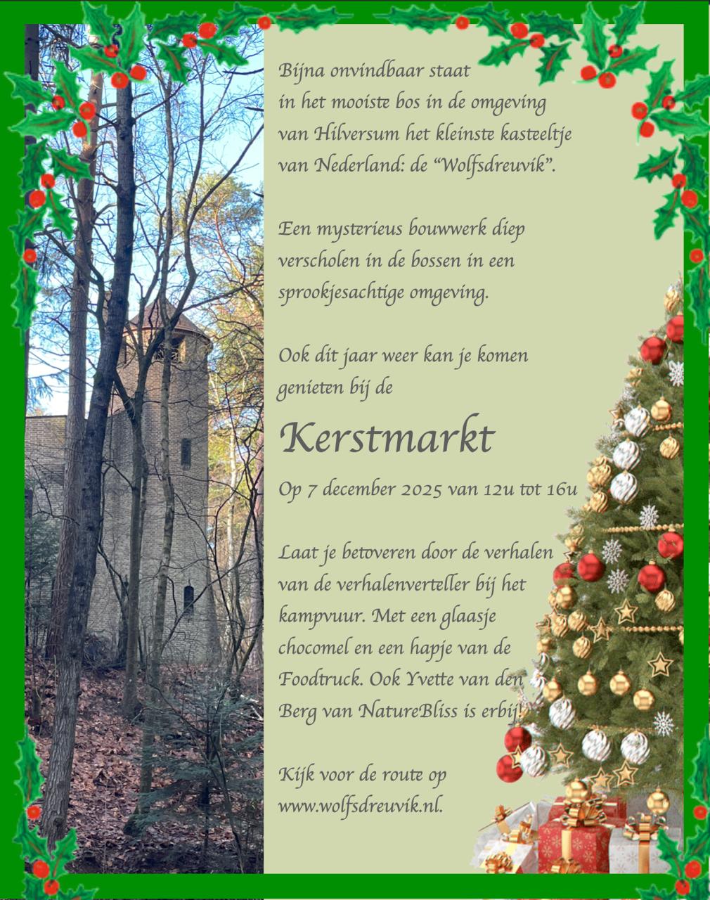 het kerstevent in het Smithuyserbos in en om het kasteeltje de Wolfsdreuvik op zondag 7 december 2025 van 12 – 16 uur!